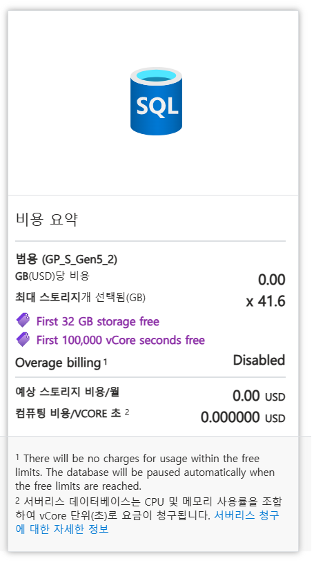 달마다 100,000 vCore 초의 컴퓨팅을 제공하고 32GB용량의 스토리지를 제공합니다. 여기서 해당 달에 제공하는 무료 컴퓨팅을 전부 소진할 경우, 다음 달까지 DB접근이 제한되거나 추가 사용량에 대한 과금을 부과하게 설정할 수도 있습니다.